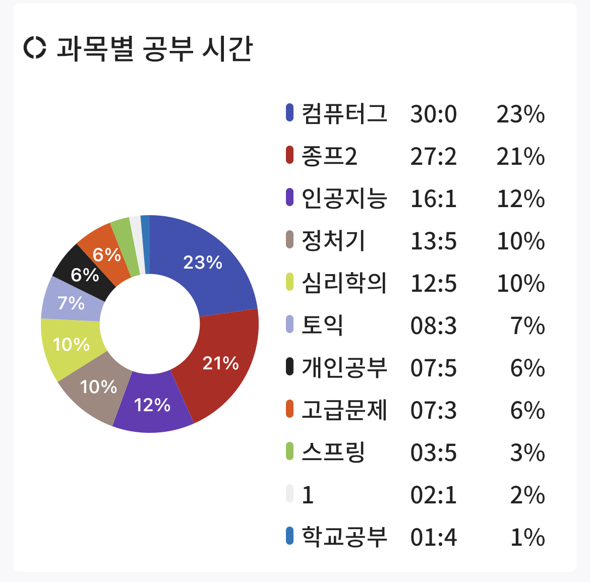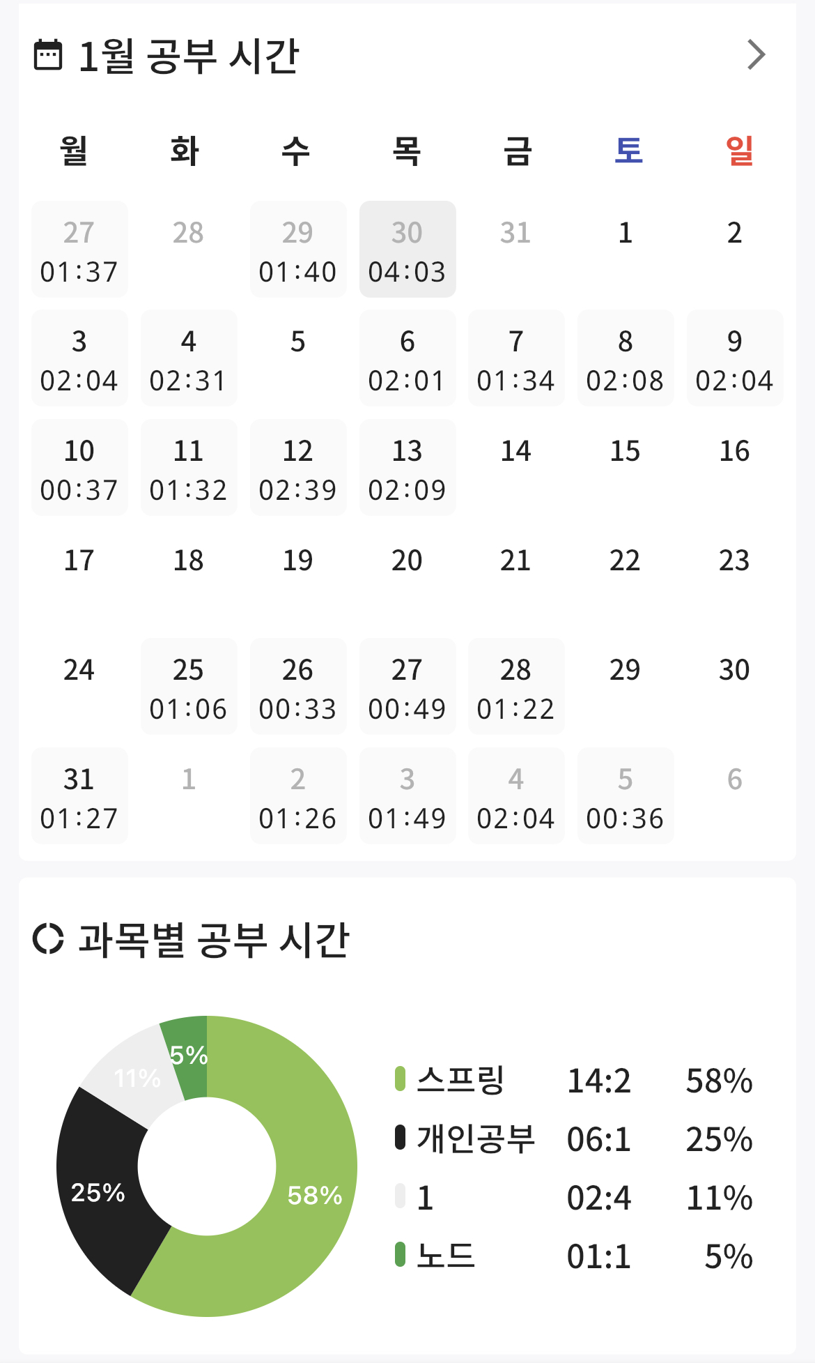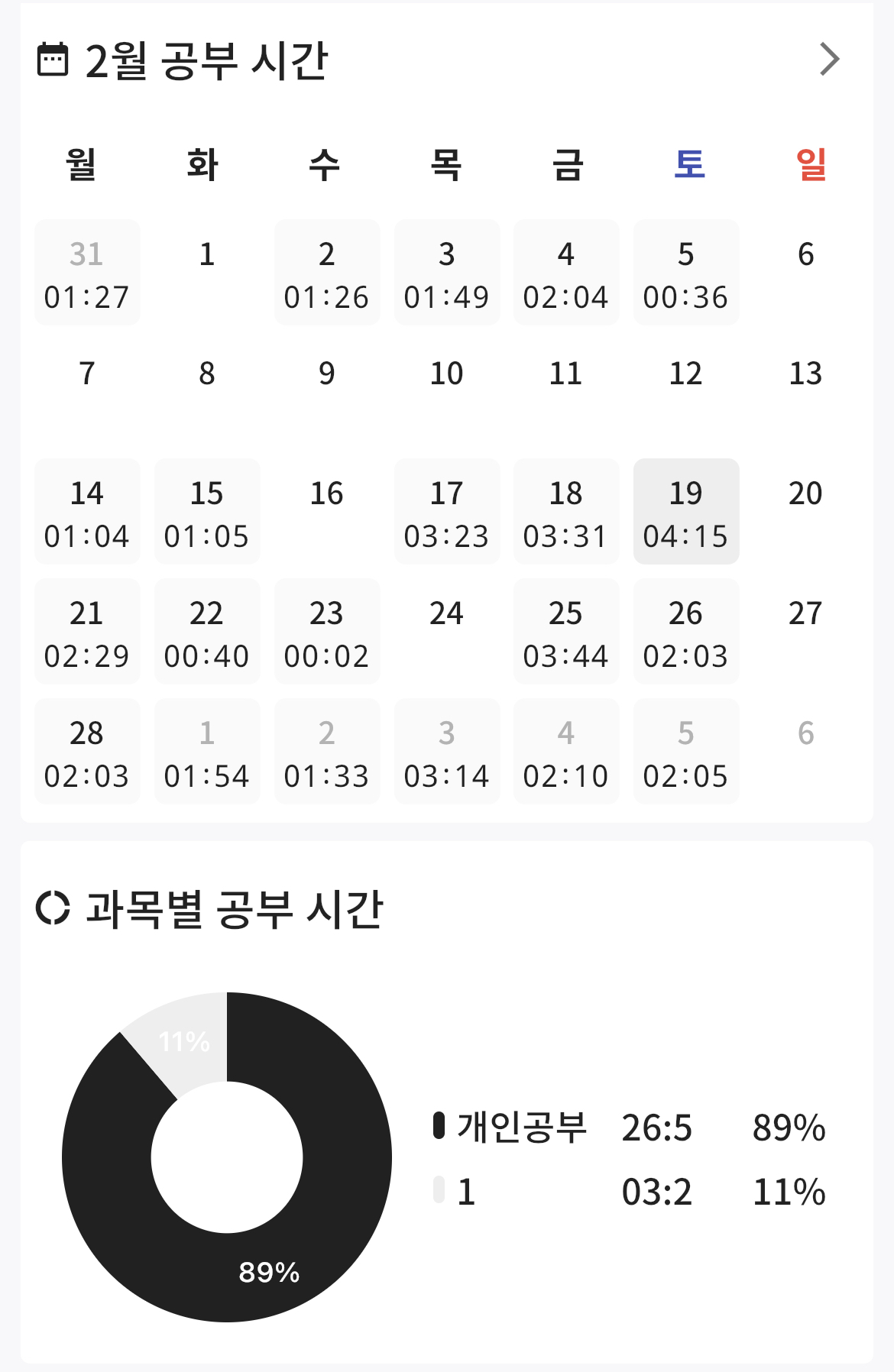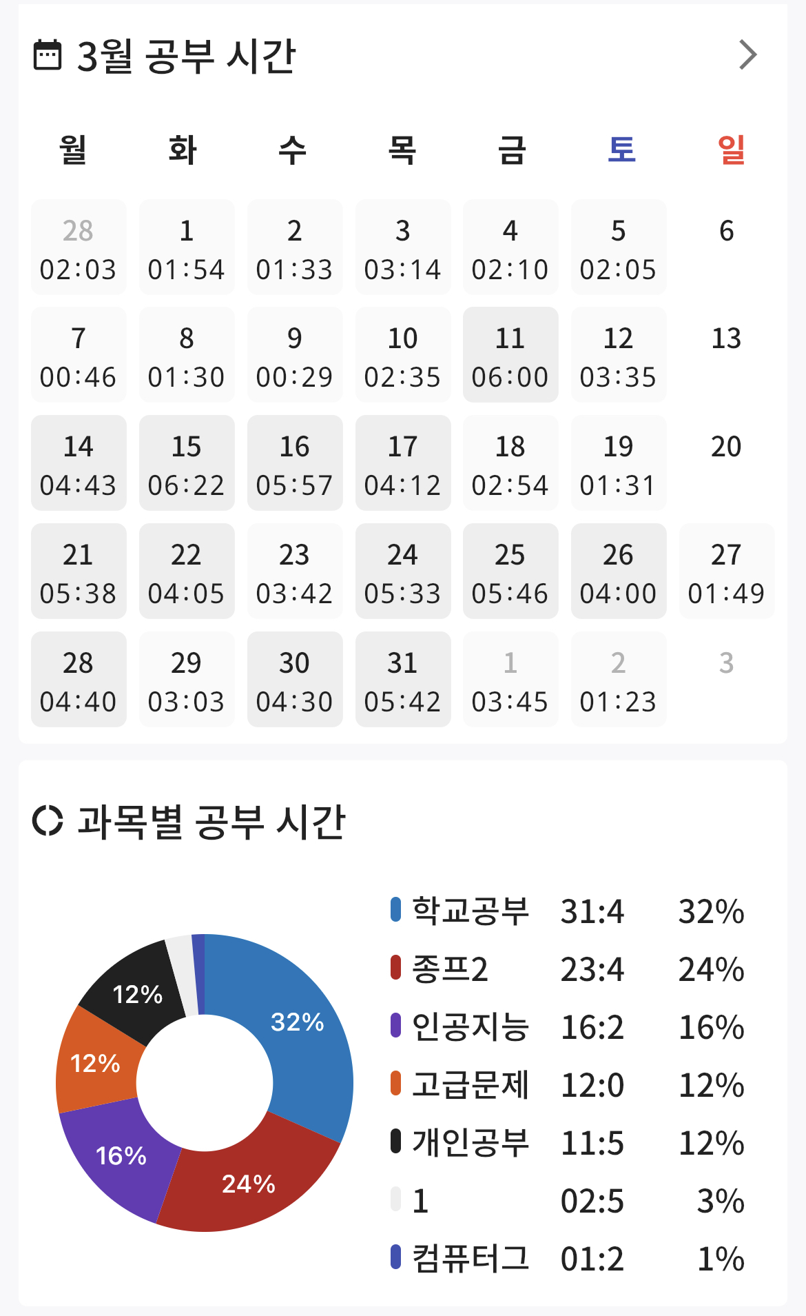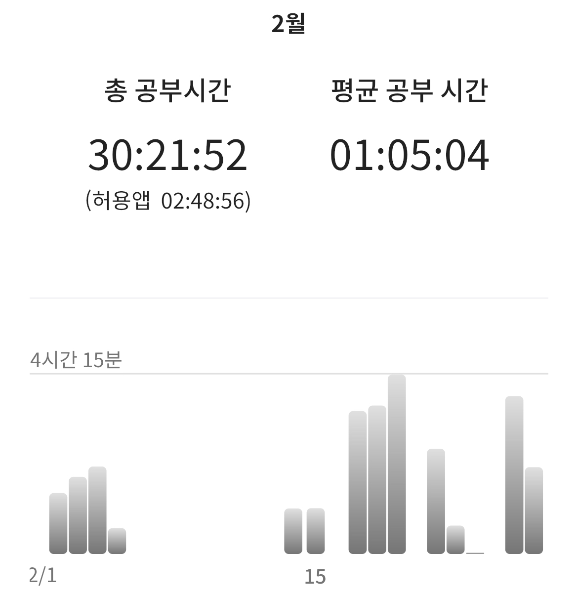 1월부터 2월까지는 현장 실습 및 휴가로 인해 공부 데이터가 좋지 않다.