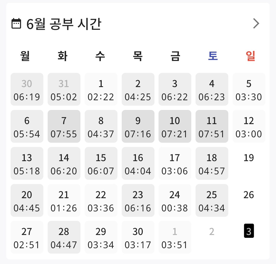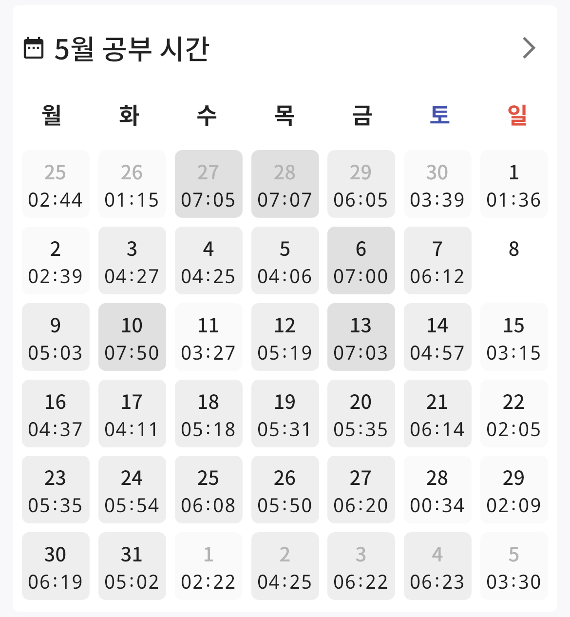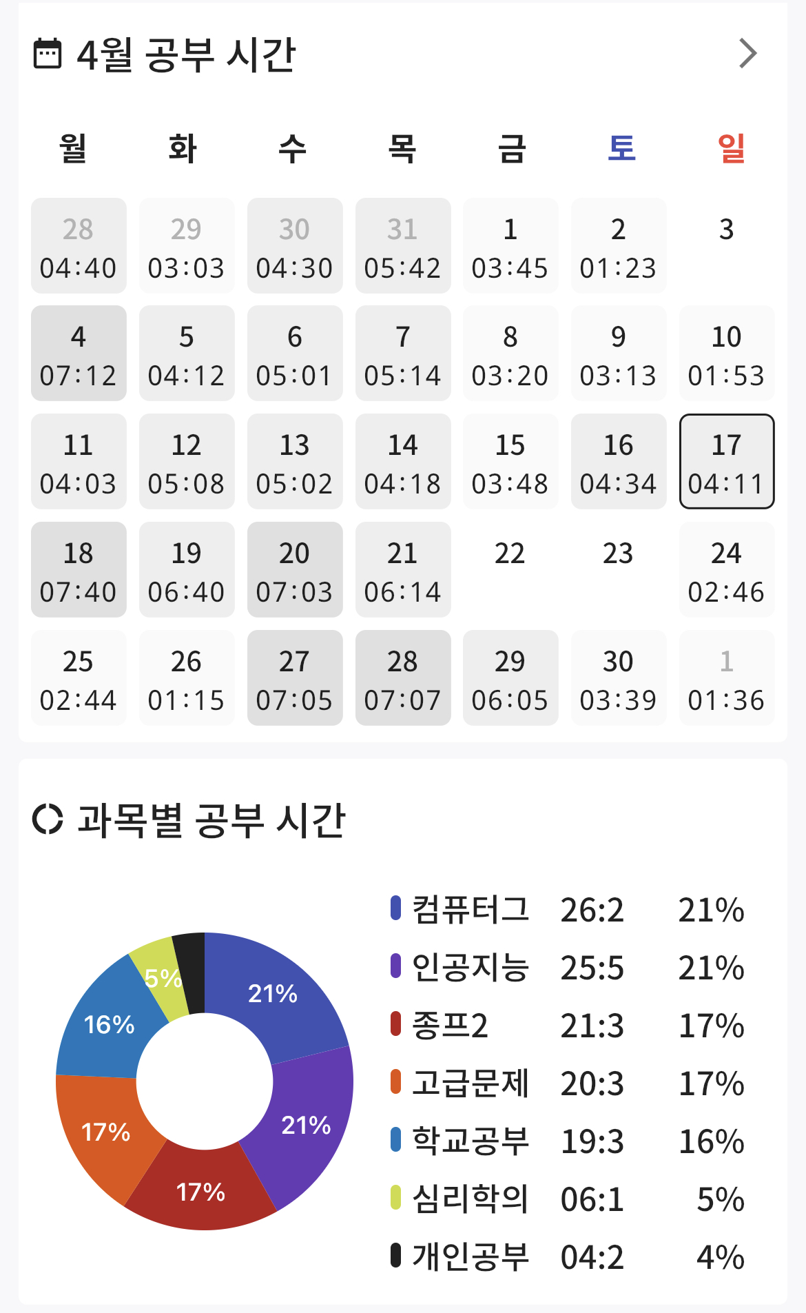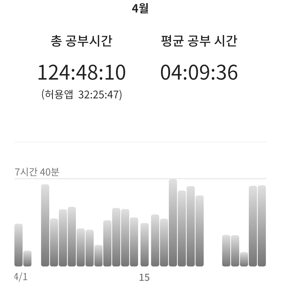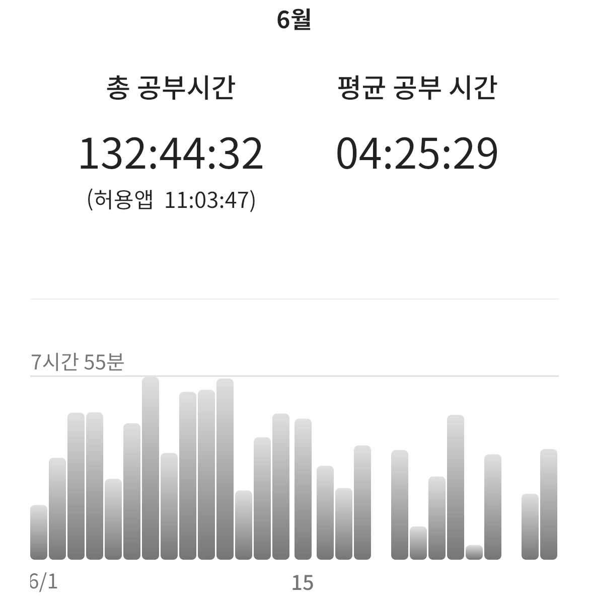 1월부터 2월까지는 현장 실습 및 휴가로 인해 공부 데이터가 좋지 않다.