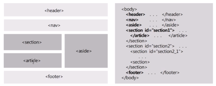 예전에는 <div> 태그를 많이 사용했으나, HTML5에서는 웹페이지에서 주로 사용하는 일반적 구조에 의미를 부여하기 위해 의미론적 요소(semantic elements)를 새롭게 정의하여 제공한다.