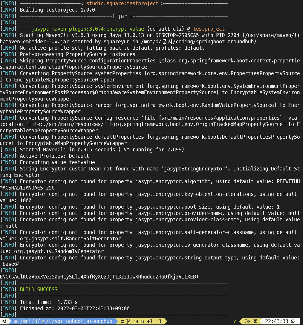 하단에 보면 ENC로 시작하는 문자열이 보일 텐데 이것을 application.properties에 추가해주면 된다.