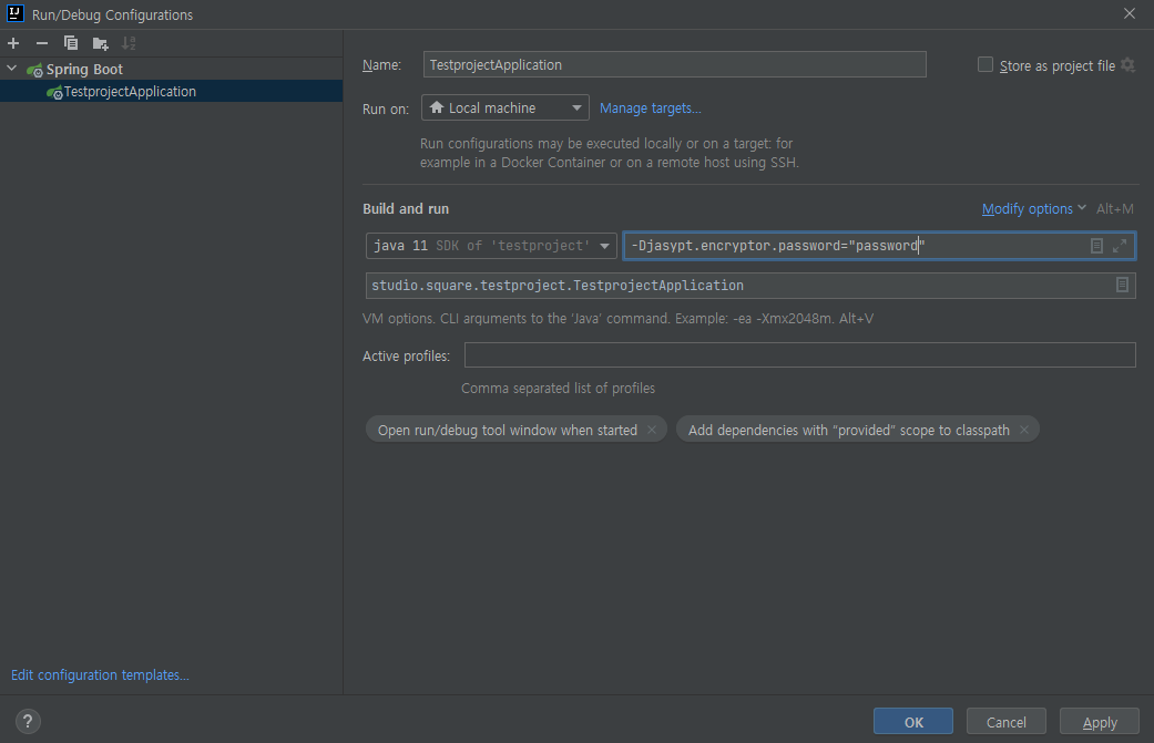 실행 버튼 왼쪽의 Edit Configurations를 클릭하고, VM 옵션으로 본인이 설정해두었던 패스워드를 전달하여야만 한다.